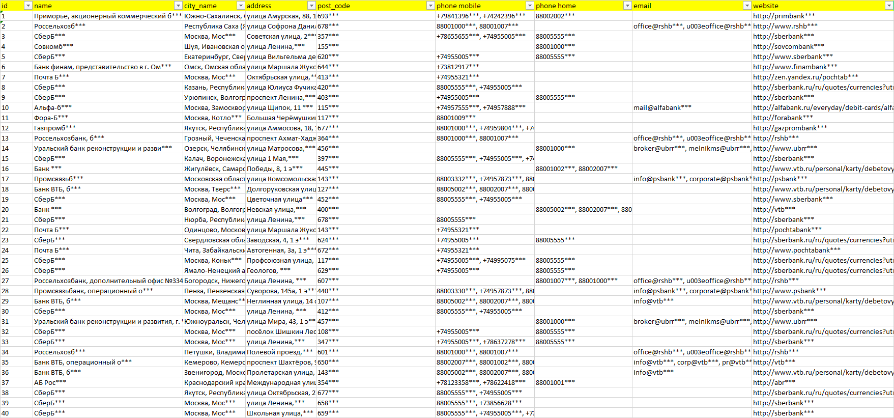 База организаций банки, вся Россия в формате Excel с эл. почтами, телефонами, сайтами, ссылками на соц сети, координатами и другой информацией. Скачайте демо версию, чтобы ознакомиться с данными.