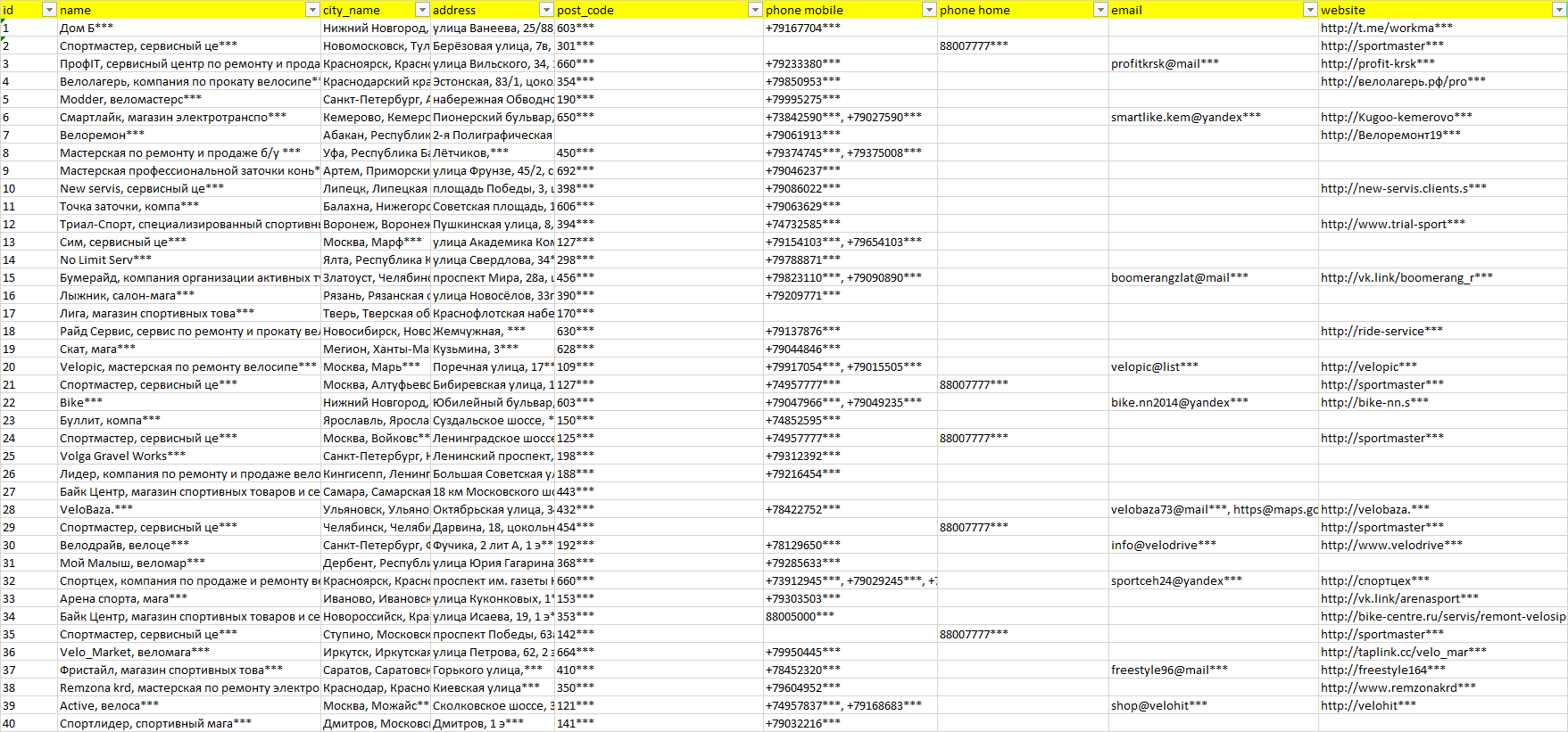 База компаний ремонт спортивного инвентаря, вся РФ в формате Excel с эл. почтами, телефонами, сайтами, ссылками на соц сети, координатами и другой информацией. Скачайте демо версию, чтобы ознакомиться с данными.