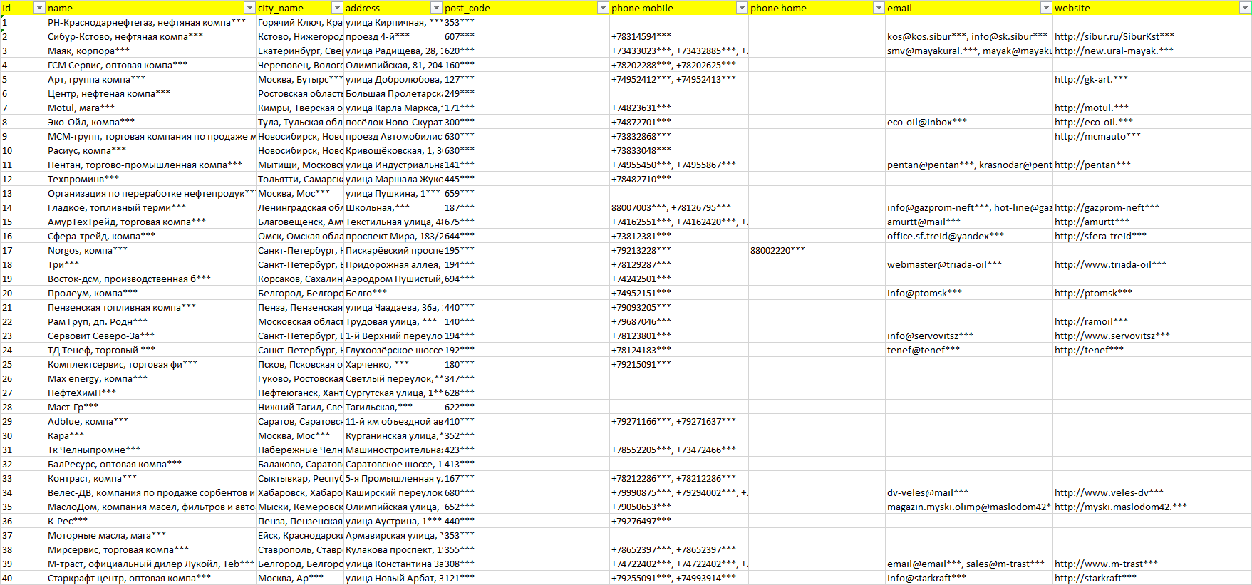 База компаний нефтепродукты и гсм, вся РФ в формате Excel с эл. почтами, телефонами, сайтами, ссылками на соц сети, координатами и другой информацией. Скачайте демо версию, чтобы ознакомиться с данными.