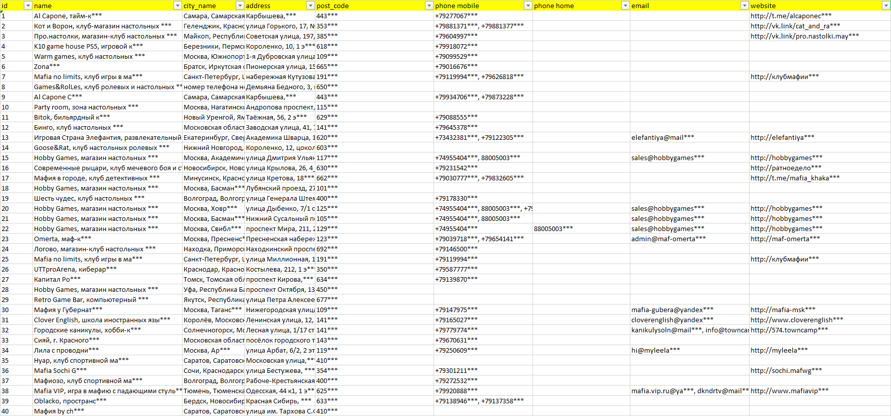 База компаний клубы настольных игр, вся РФ в формате Excel с эл. почтами, телефонами, сайтами, ссылками на соц сети, координатами и другой информацией. Скачайте демо версию, чтобы ознакомиться с данными.