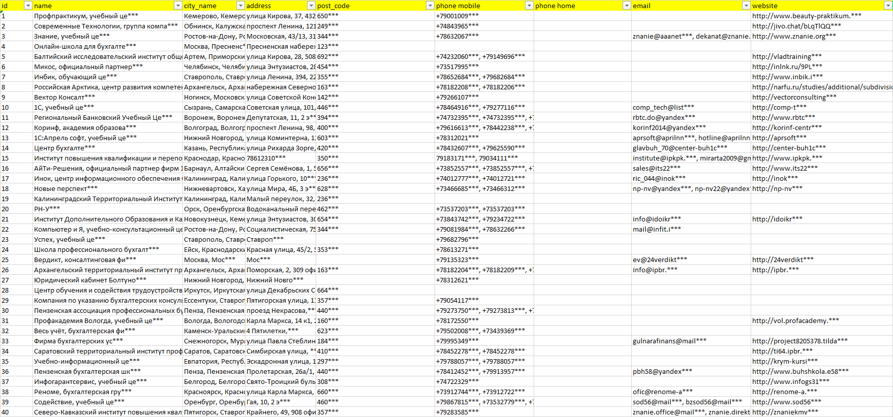 База организаций бухгалтерские курсы, вся Россия в формате Excel с эл. почтами, телефонами, сайтами, ссылками на соц сети, координатами и другой информацией. Скачайте демо версию, чтобы ознакомиться с данными.