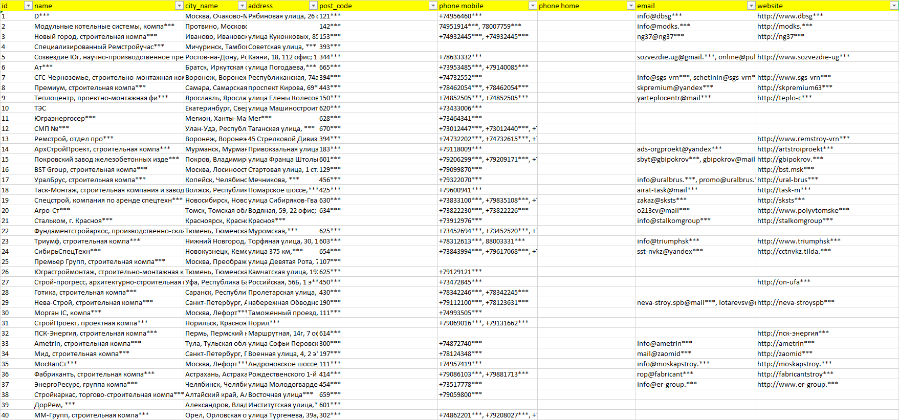 База организаций промышленное строительство, вся Россия в формате Excel с эл. почтами, телефонами, сайтами, ссылками на соц сети, координатами и другой информацией. Скачайте демо версию, чтобы ознакомиться с данными.