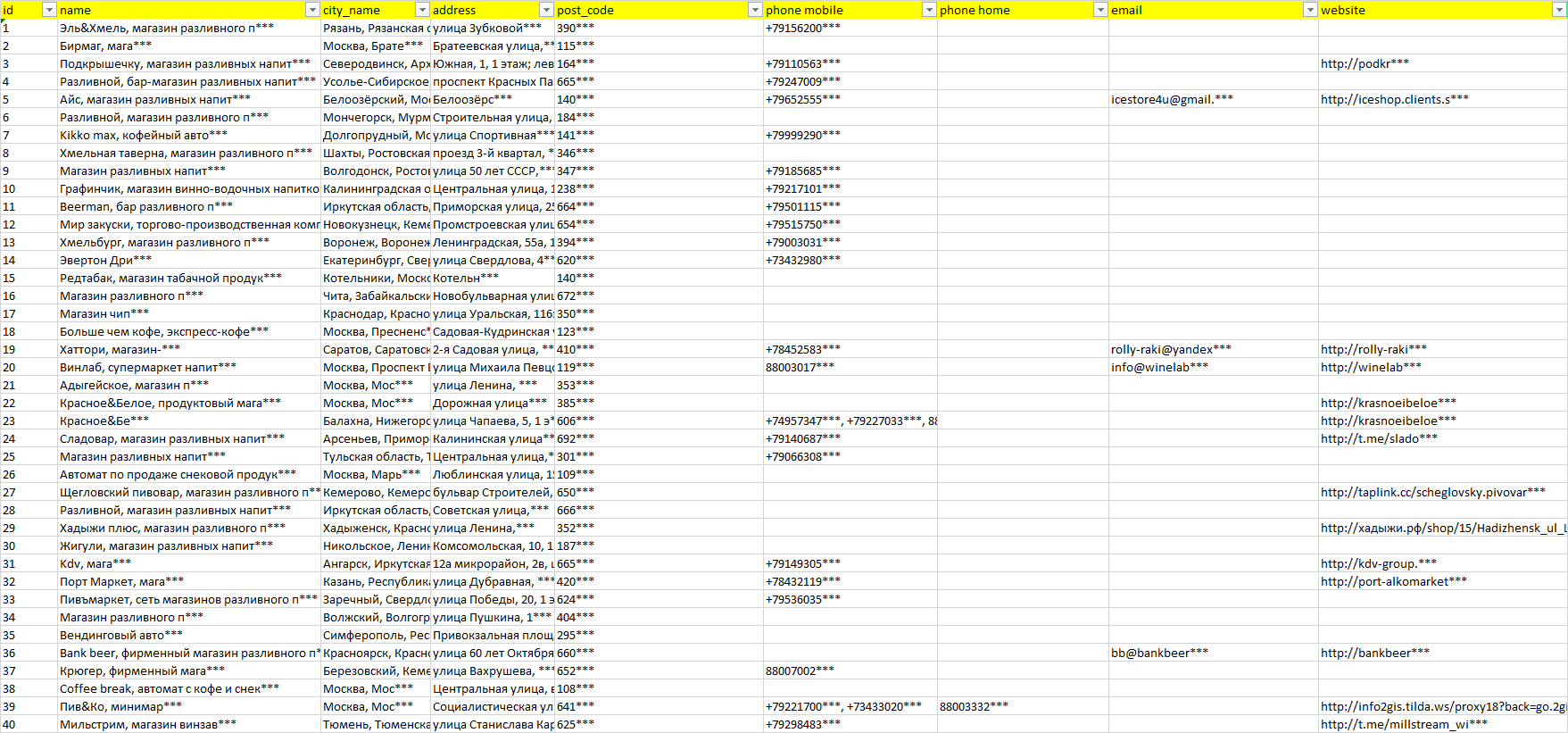 База компаний снеки, вся РФ в формате Excel с эл. почтами, телефонами, сайтами, ссылками на соц сети, координатами и другой информацией. Скачайте демо версию, чтобы ознакомиться с данными.