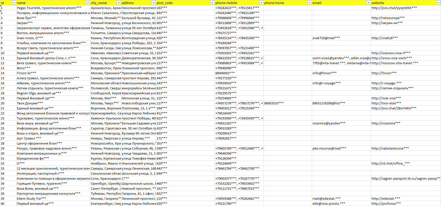 База компаний помощь в оформлении загранпаспортов, вся РФ в формате Excel с эл. почтами, телефонами, сайтами, ссылками на соц сети, координатами и другой информацией. Скачайте демо версию, чтобы ознакомиться с данными.