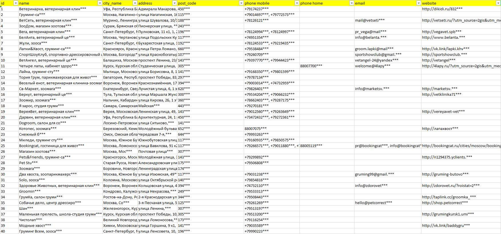База компаний уход за животными, вся РФ в формате Excel с эл. почтами, телефонами, сайтами, ссылками на соц сети, координатами и другой информацией. Скачайте демо версию, чтобы ознакомиться с данными.