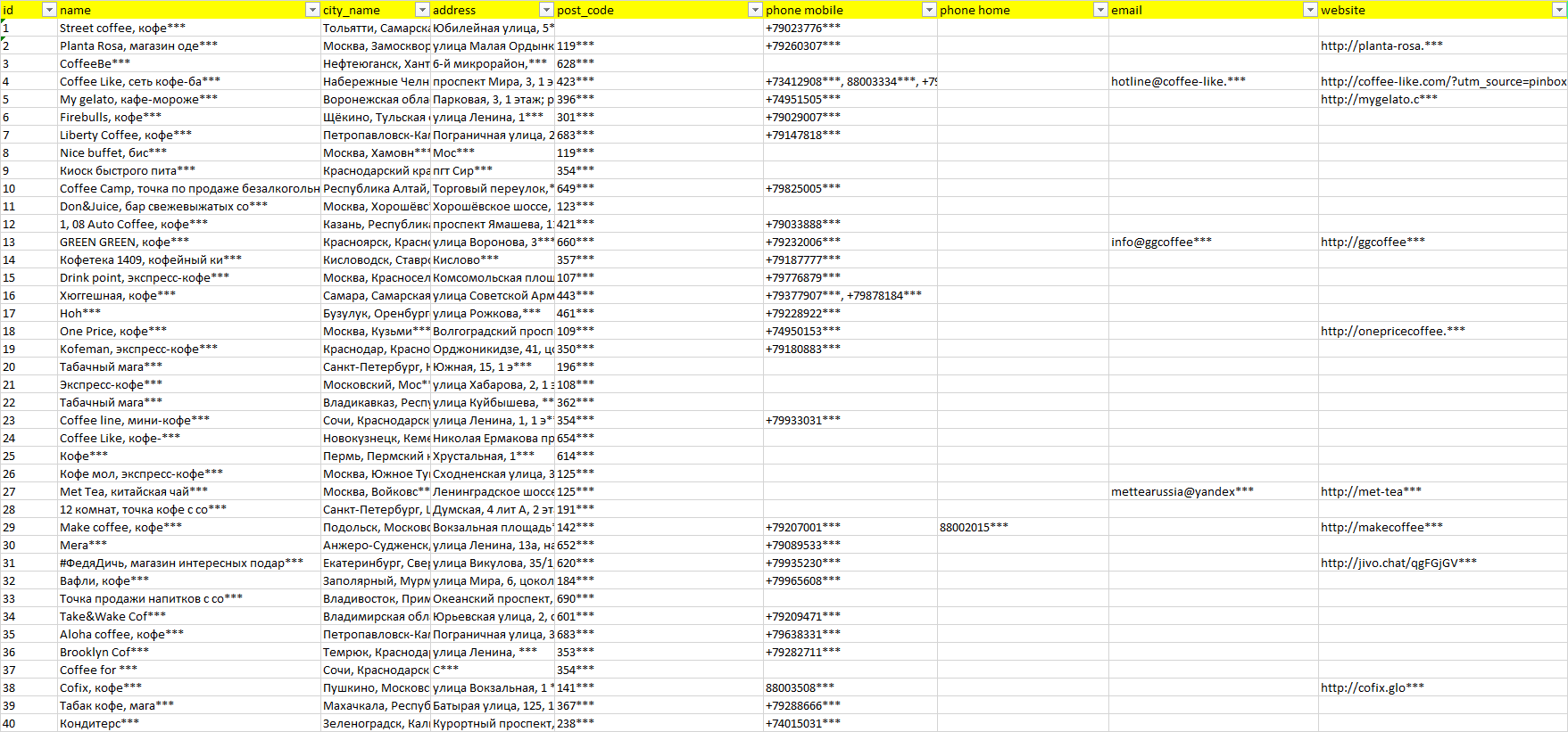 База организаций точки кофе, вся Россия в формате Excel с эл. почтами, телефонами, сайтами, ссылками на соц сети, координатами и другой информацией. Скачайте демо версию, чтобы ознакомиться с данными.