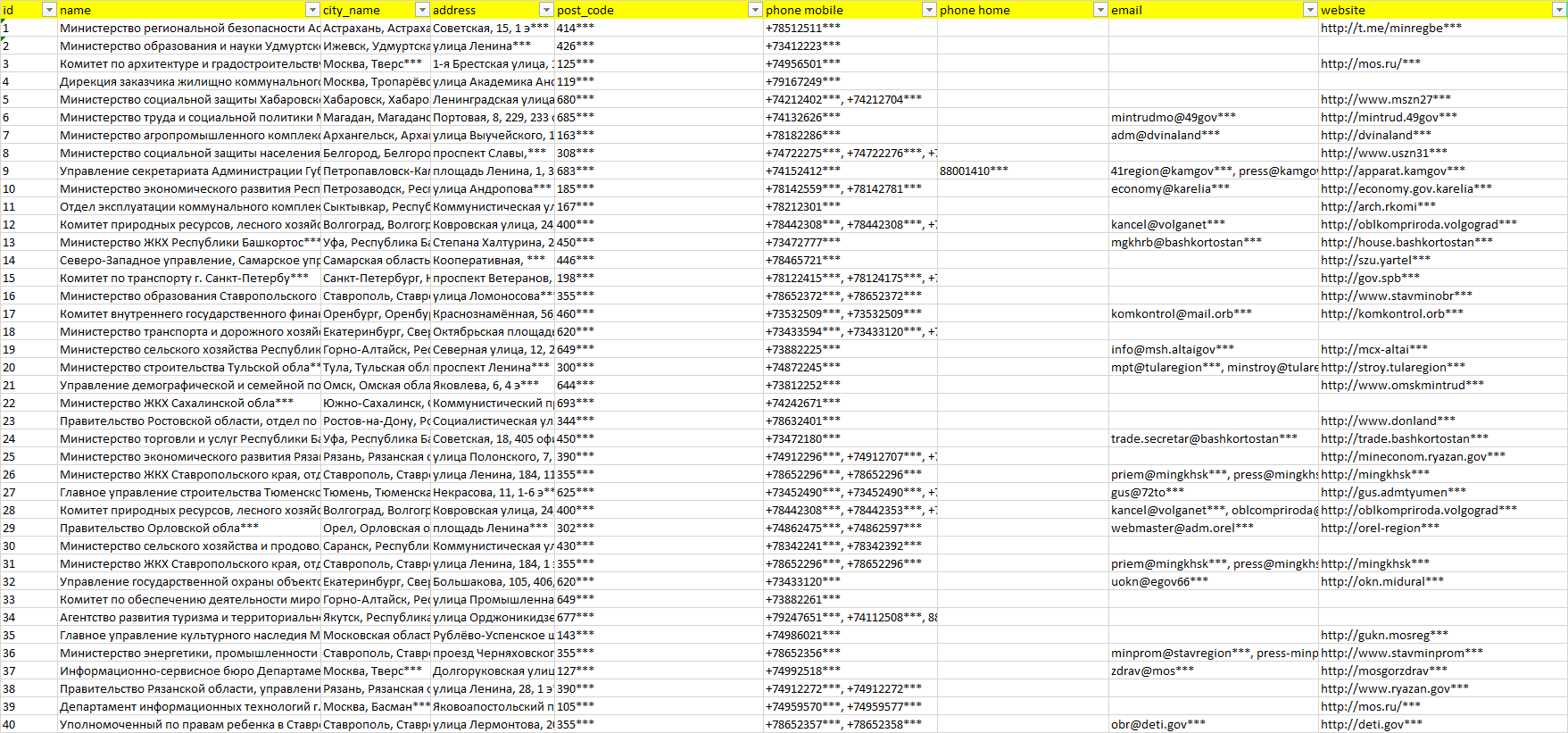 База организаций правительство, вся Россия в формате Excel с эл. почтами, телефонами, сайтами, ссылками на соц сети, координатами и другой информацией. Скачайте демо версию, чтобы ознакомиться с данными.