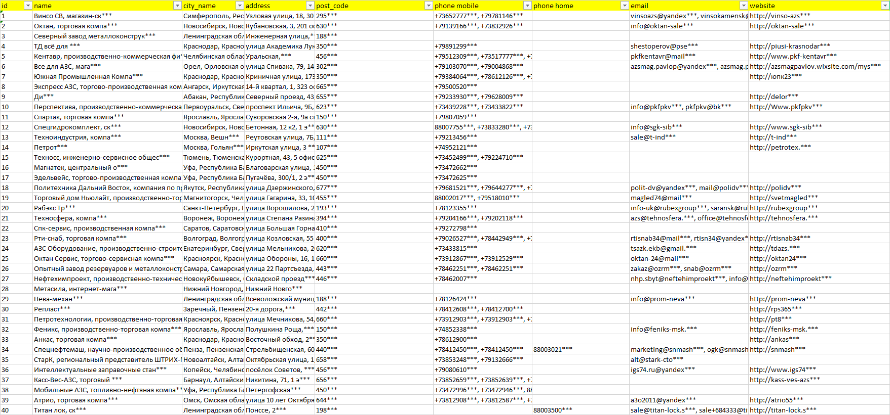 База организаций оборудование для азс и нефтебаз, вся Россия в формате Excel с эл. почтами, телефонами, сайтами, ссылками на соц сети, координатами и другой информацией. Скачайте демо версию, чтобы ознакомиться с данными.