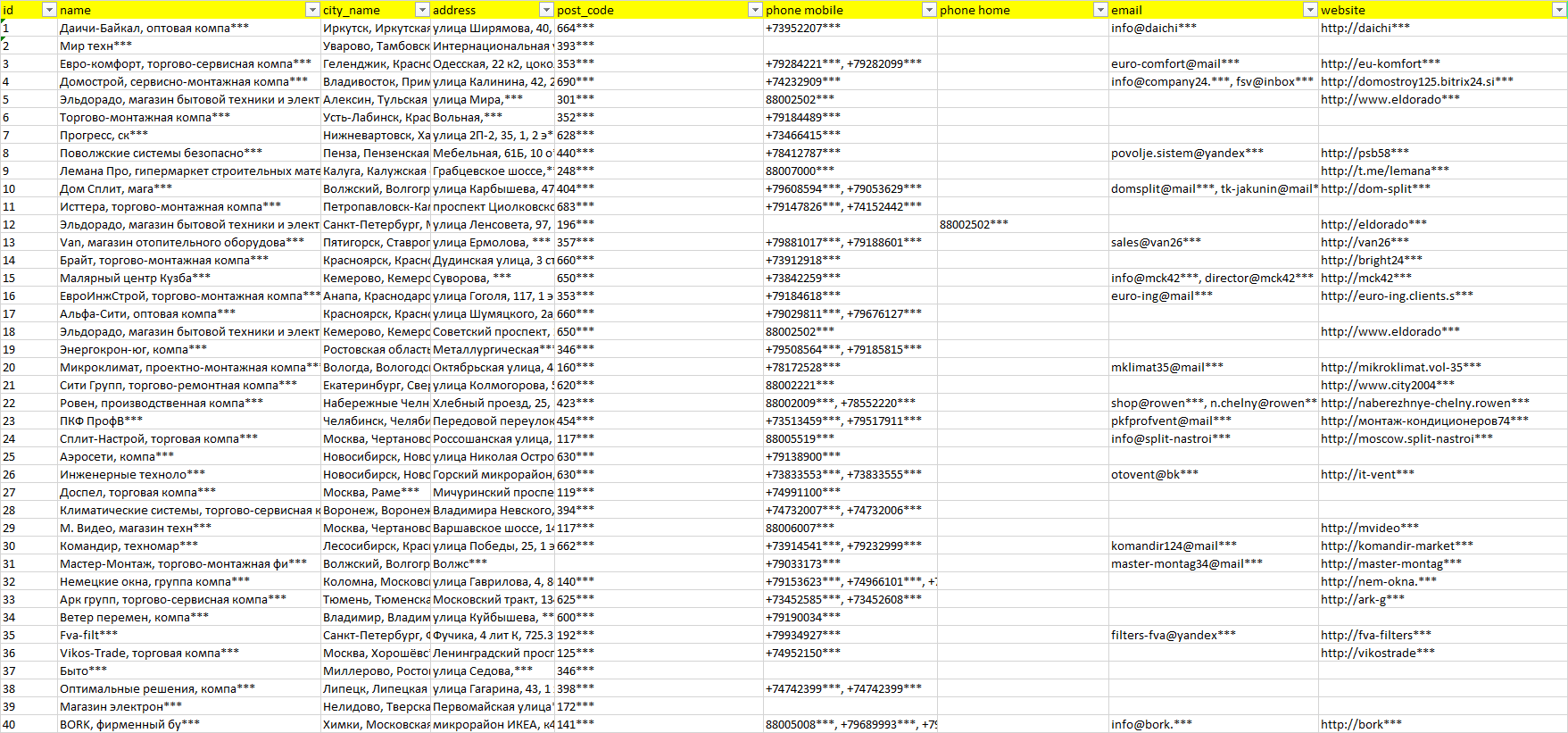 База компаний кондиционеры, вся РФ в формате Excel с эл. почтами, телефонами, сайтами, ссылками на соц сети, координатами и другой информацией. Скачайте демо версию, чтобы ознакомиться с данными.