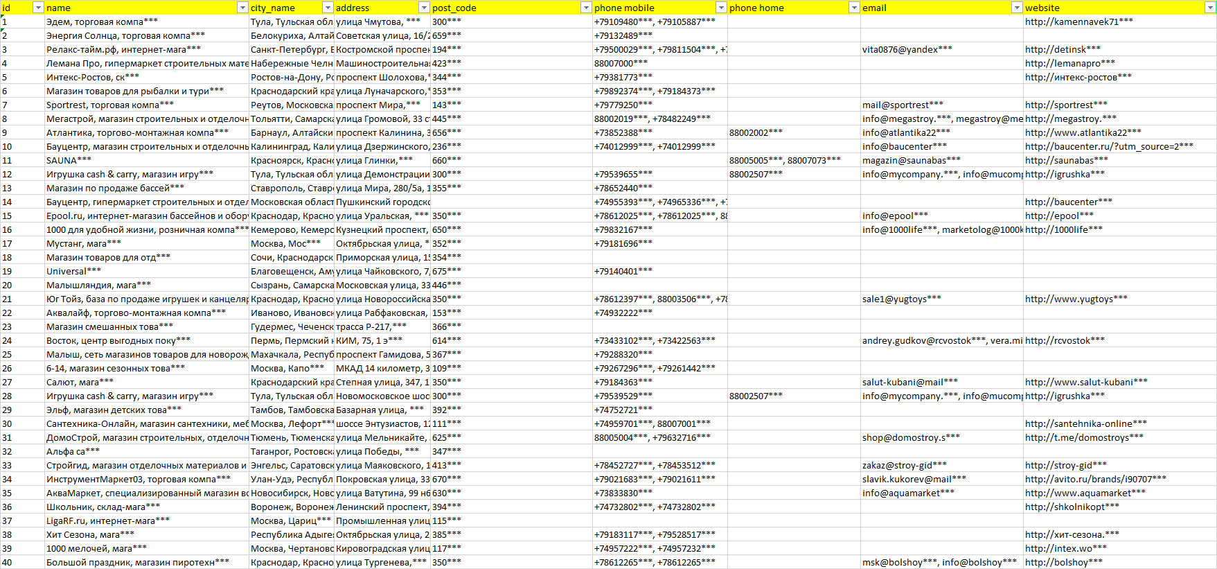 Мы автоматически собираем такие данные с различных открытых источников, обрабатываем, структурирует и упорядочиваем их, предоставляя пользователю возможность скачать результат в формате Excel. По принципу работы наш сервис аналогичен поисковым системам, таким как Google или Яндекс, но с возможностью экспорта найденной информации в удобном табличном виде.
