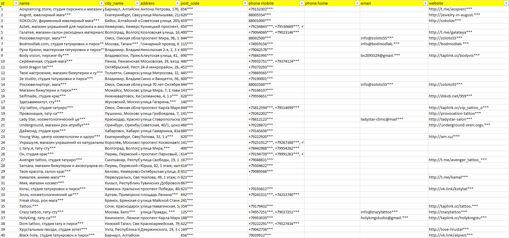 База организаций украшения для пирсинга, вся Россия в формате Excel с эл. почтами, телефонами, сайтами, ссылками на соц сети, координатами и другой информацией. Скачайте демо версию, чтобы ознакомиться с данными.