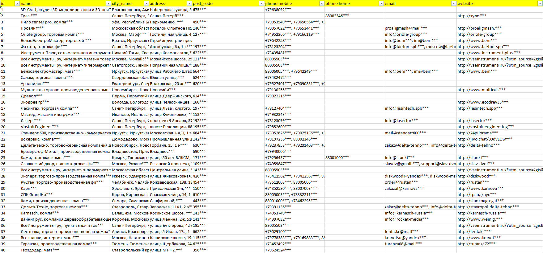 Мы автоматически собираем такие данные с различных открытых источников, обрабатываем, структурирует и упорядочиваем их, предоставляя пользователю возможность скачать результат в формате Excel. По принципу работы наш сервис аналогичен поисковым системам, таким как Google или Яндекс, но с возможностью экспорта найденной информации в удобном табличном виде.