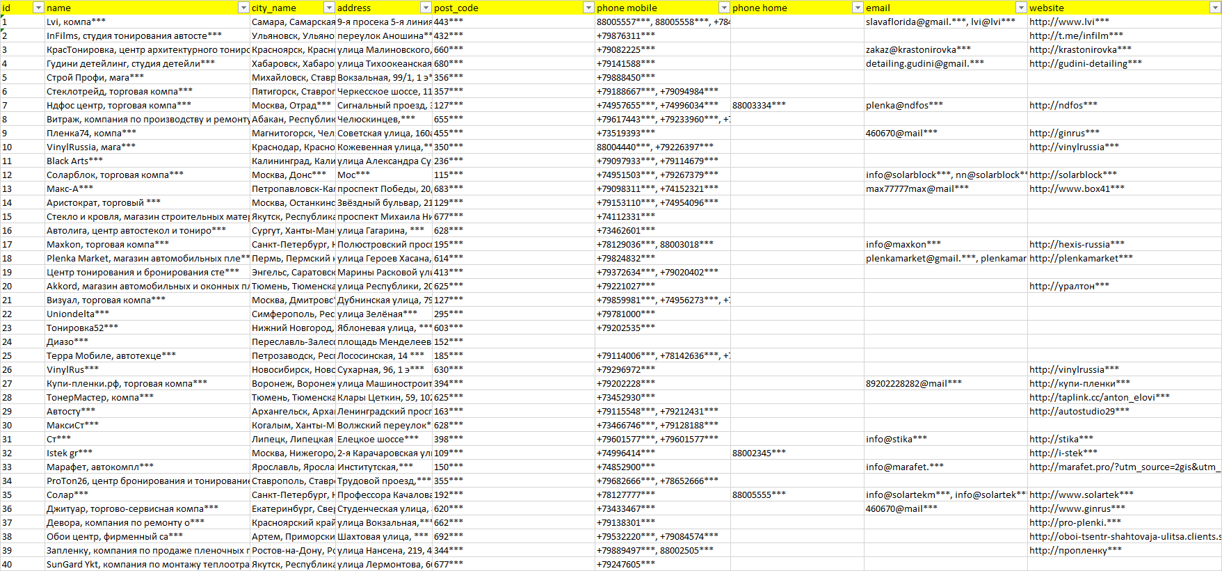 База компаний плёнки для стёкол зданий, вся РФ в формате Excel с эл. почтами, телефонами, сайтами, ссылками на соц сети, координатами и другой информацией. Скачайте демо версию, чтобы ознакомиться с данными.