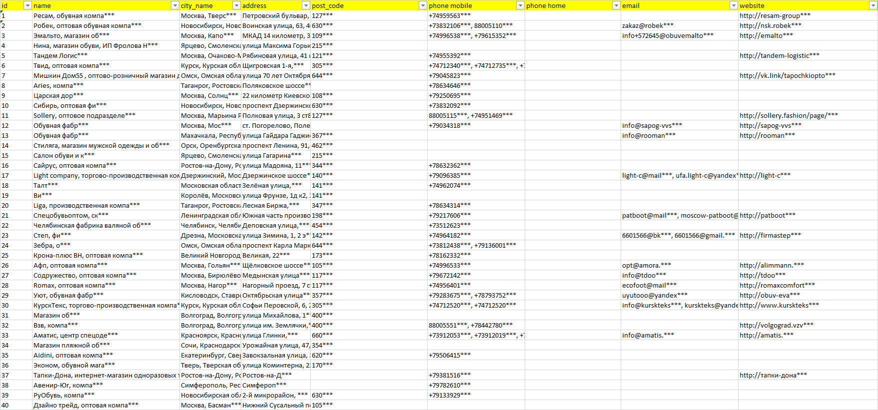 База организаций обувь - опт, вся Россия в формате Excel с эл. почтами, телефонами, сайтами, ссылками на соц сети, координатами и другой информацией. Скачайте демо версию, чтобы ознакомиться с данными.