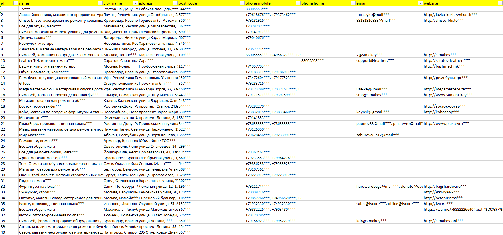 База организаций материалы для производства обуви, вся Россия в формате Excel с эл. почтами, телефонами, сайтами, ссылками на соц сети, координатами и другой информацией. Скачайте демо версию, чтобы ознакомиться с данными.