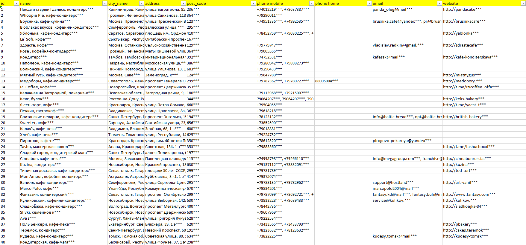 База организаций кафе-кондитерские, вся Россия в формате Excel с эл. почтами, телефонами, сайтами, ссылками на соц сети, координатами и другой информацией. Скачайте демо версию, чтобы ознакомиться с данными.