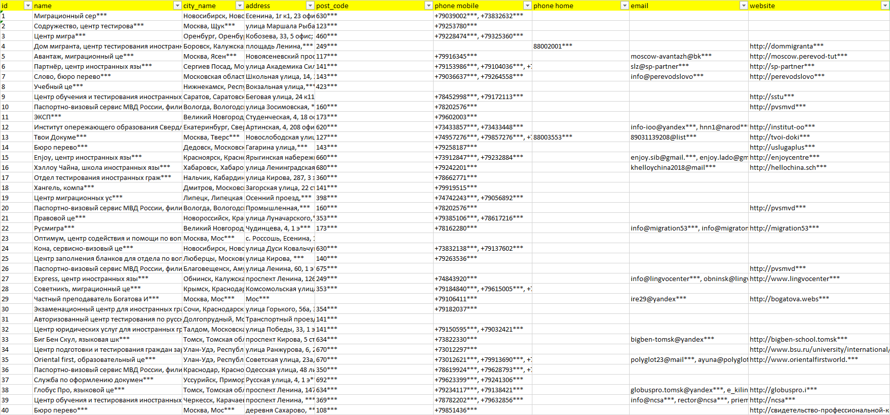 База организаций подготовка иностранцев по русскому языку, вся Россия в формате Excel с эл. почтами, телефонами, сайтами, ссылками на соц сети, координатами и другой информацией. Скачайте демо версию, чтобы ознакомиться с данными.