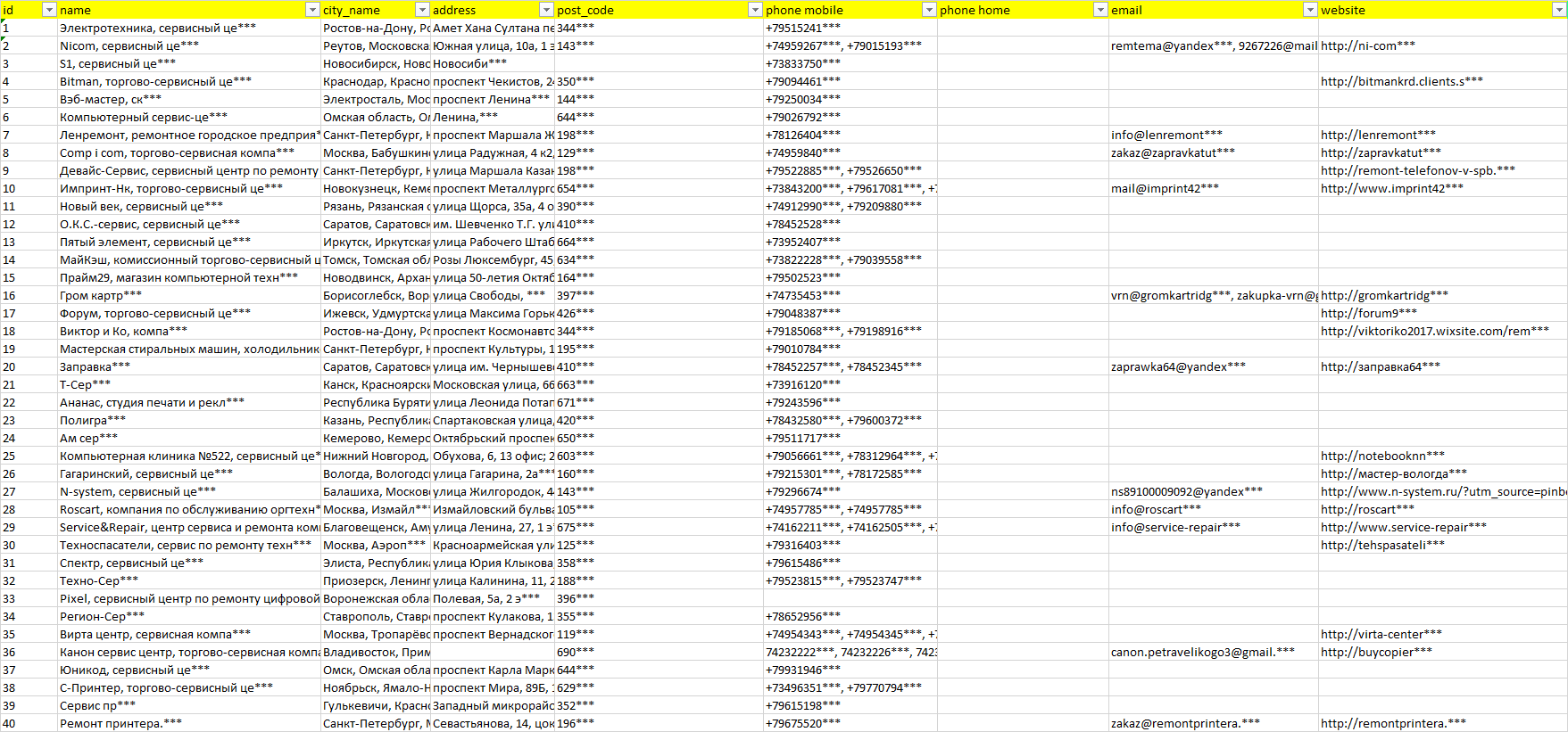 База организаций ремонт оргтехники, вся Россия в формате Excel с эл. почтами, телефонами, сайтами, ссылками на соц сети, координатами и другой информацией. Скачайте демо версию, чтобы ознакомиться с данными.
