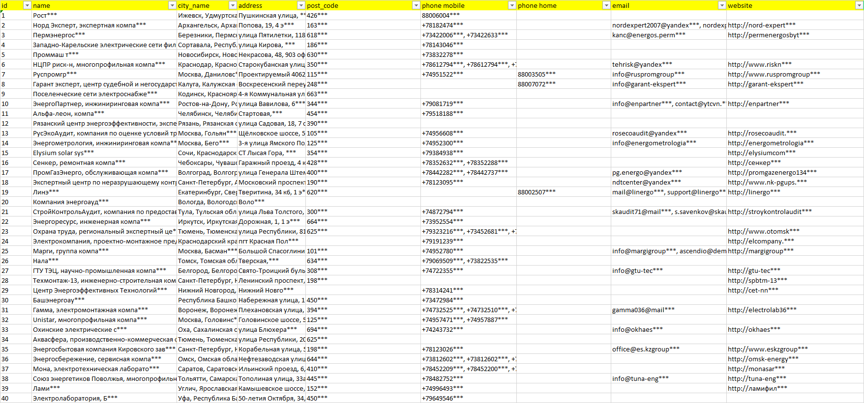База компаний энергоаудит, вся РФ в формате Excel с эл. почтами, телефонами, сайтами, ссылками на соц сети, координатами и другой информацией. Скачайте демо версию, чтобы ознакомиться с данными.