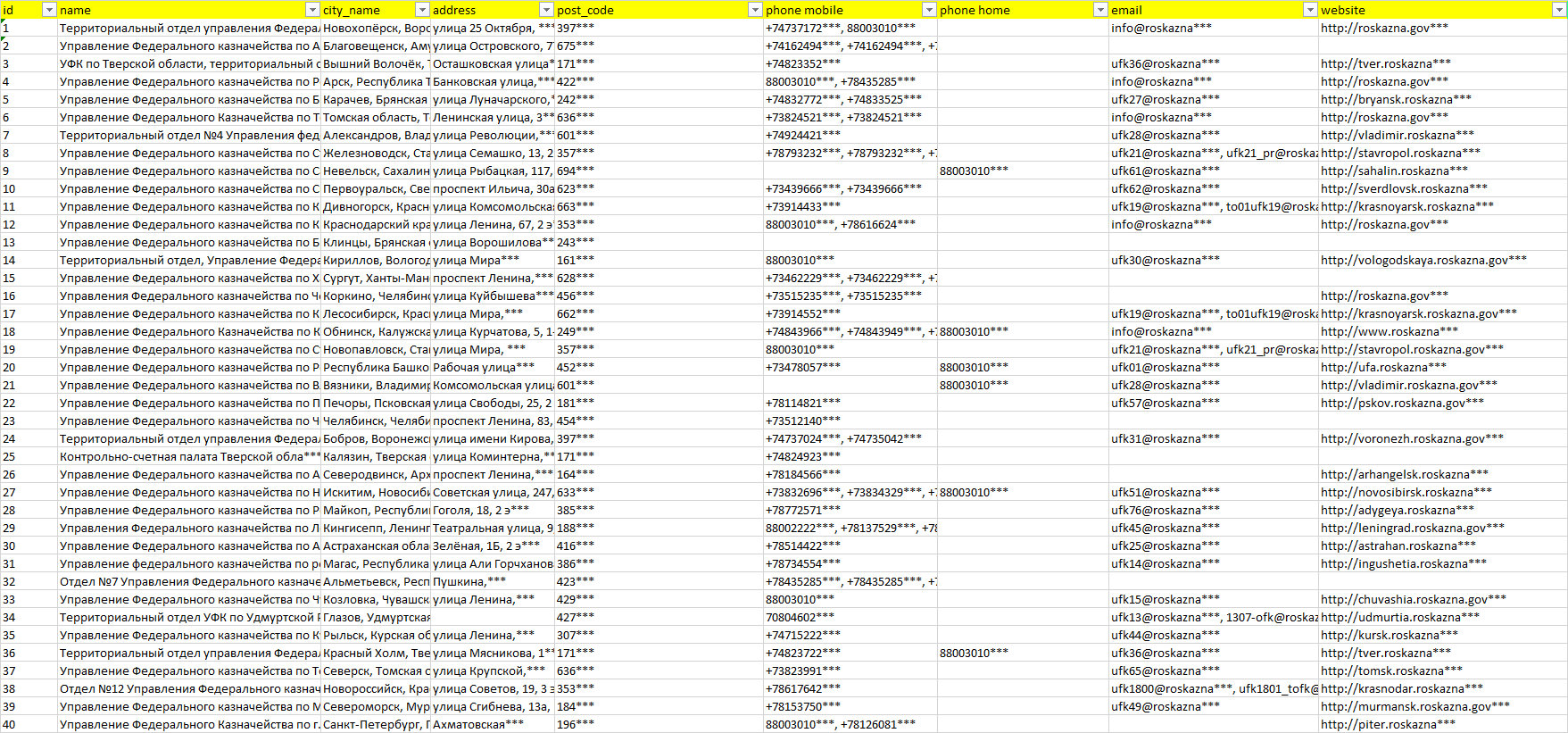 База организаций федеральные казначейства, вся Россия в формате Excel с эл. почтами, телефонами, сайтами, ссылками на соц сети, координатами и другой информацией. Скачайте демо версию, чтобы ознакомиться с данными.