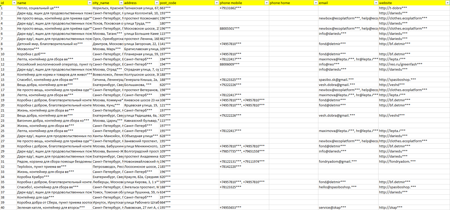 База компаний благотворительные контейнеры, вся РФ в формате Excel с эл. почтами, телефонами, сайтами, ссылками на соц сети, координатами и другой информацией. Скачайте демо версию, чтобы ознакомиться с данными.