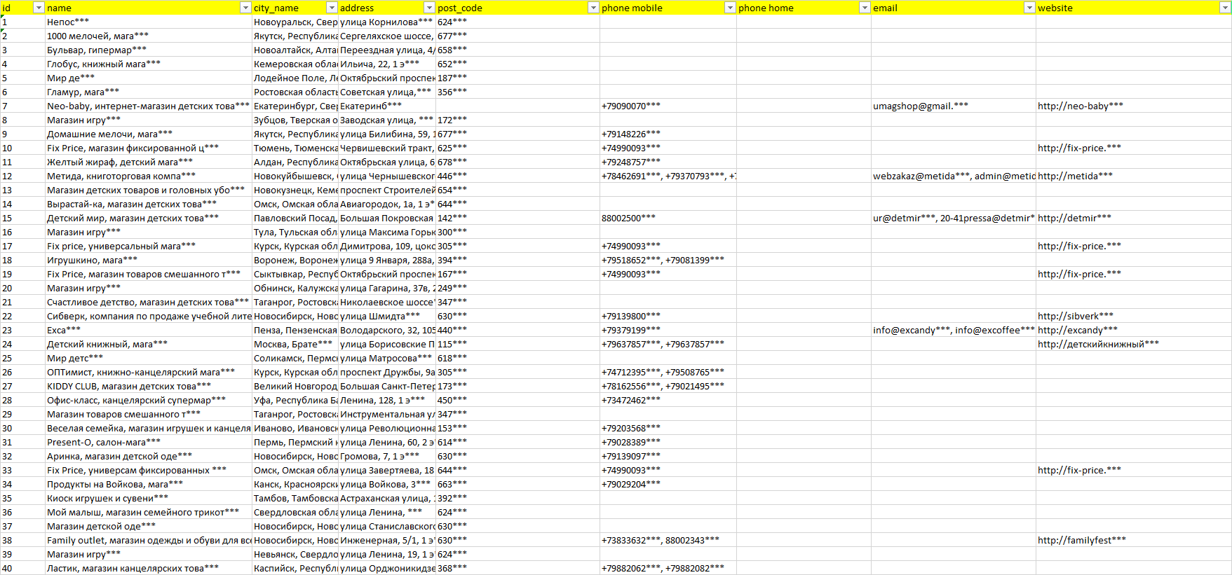База организаций игрушки, вся Россия в формате Excel с эл. почтами, телефонами, сайтами, ссылками на соц сети, координатами и другой информацией. Скачайте демо версию, чтобы ознакомиться с данными.