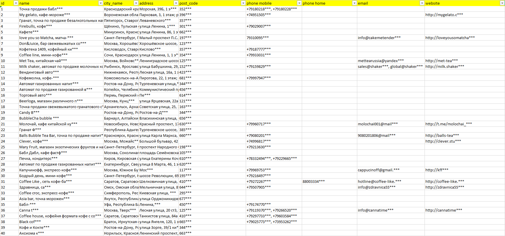 База организаций точки безалкогольных напитков, вся Россия в формате Excel с эл. почтами, телефонами, сайтами, ссылками на соц сети, координатами и другой информацией. Скачайте демо версию, чтобы ознакомиться с данными.