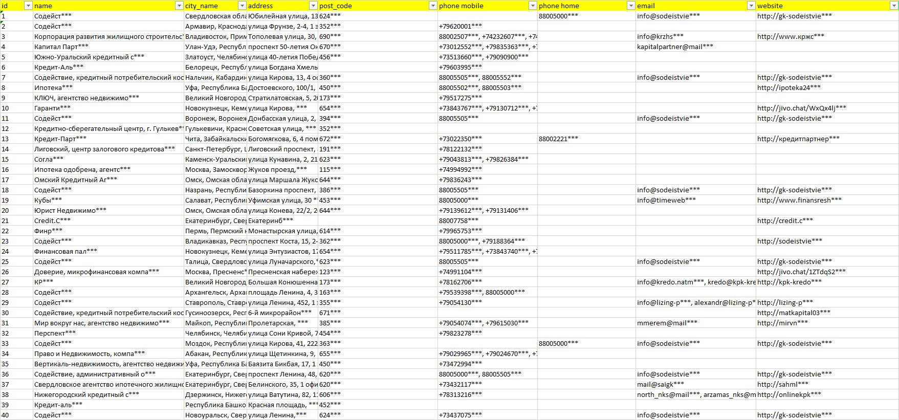 База организаций ипотечные займы, вся Россия в формате Excel с эл. почтами, телефонами, сайтами, ссылками на соц сети, координатами и другой информацией. Скачайте демо версию, чтобы ознакомиться с данными.