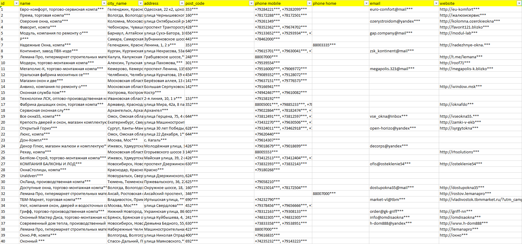 База компаний комплектующие для окон, вся РФ в формате Excel с эл. почтами, телефонами, сайтами, ссылками на соц сети, координатами и другой информацией. Скачайте демо версию, чтобы ознакомиться с данными.