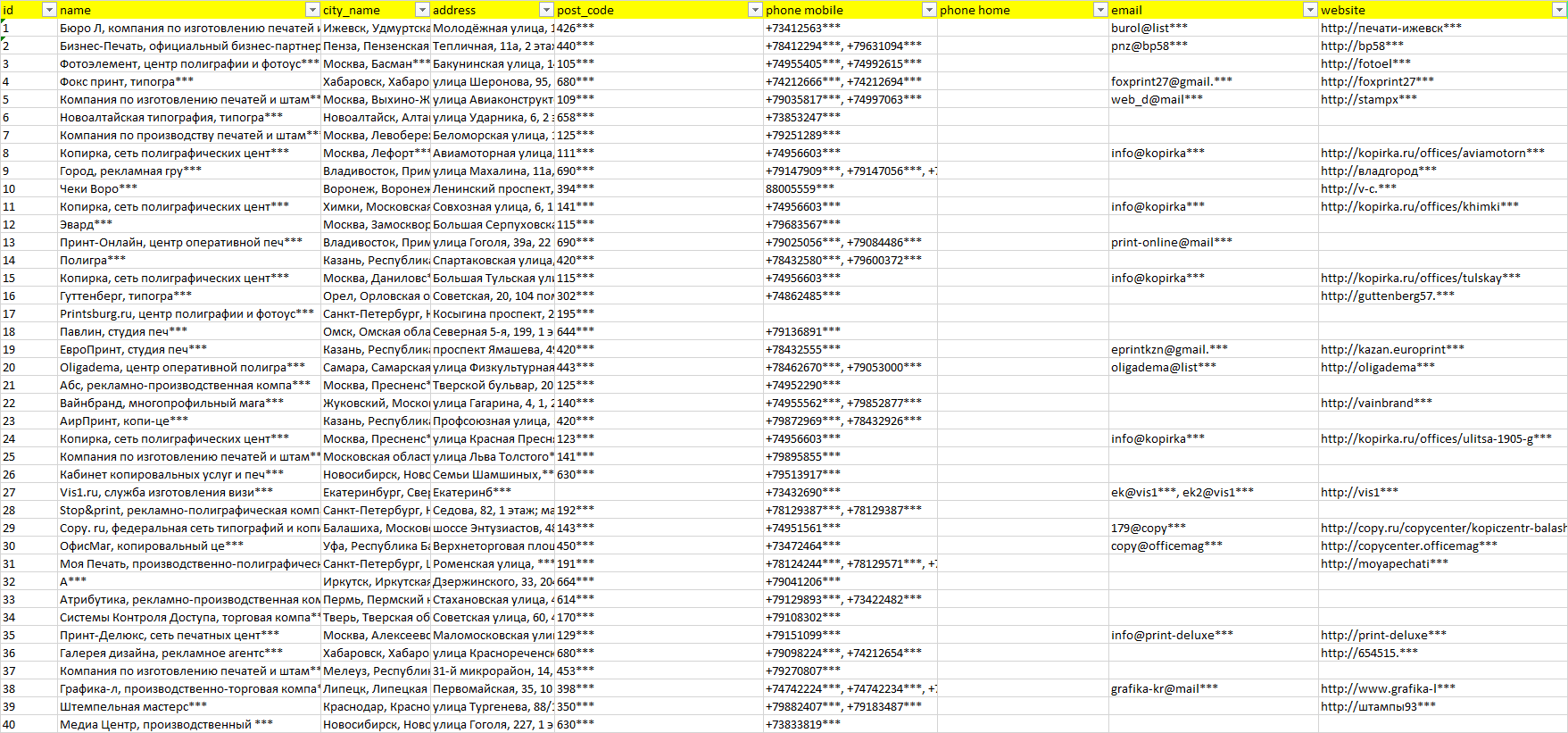 Мы автоматически собираем такие данные с различных открытых источников, обрабатываем, структурирует и упорядочиваем их, предоставляя пользователю возможность скачать результат в формате Excel. По принципу работы наш сервис аналогичен поисковым системам, таким как Google или Яндекс, но с возможностью экспорта найденной информации в удобном табличном виде.