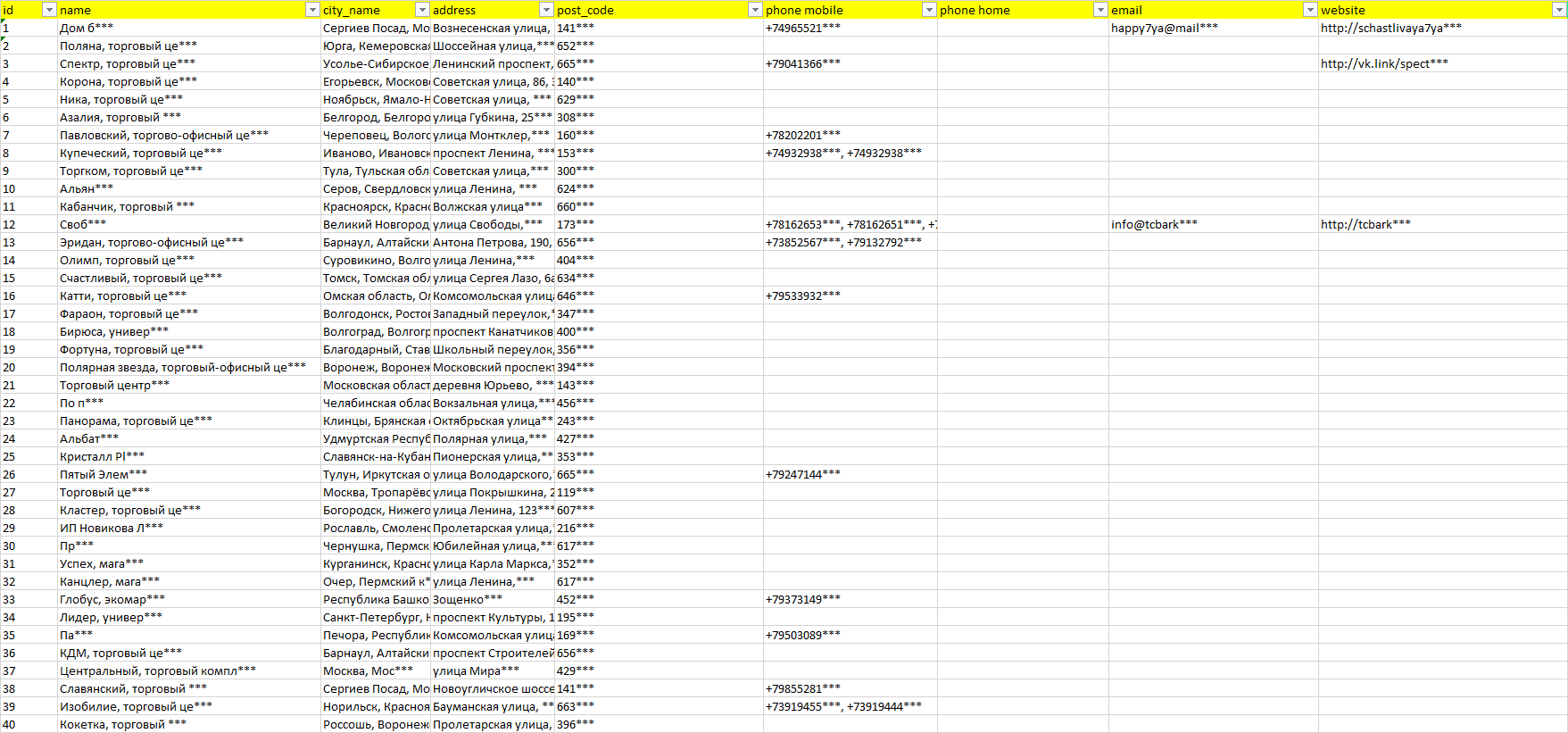 База организаций торговые центры, вся Россия в формате Excel с эл. почтами, телефонами, сайтами, ссылками на соц сети, координатами и другой информацией. Скачайте демо версию, чтобы ознакомиться с данными.