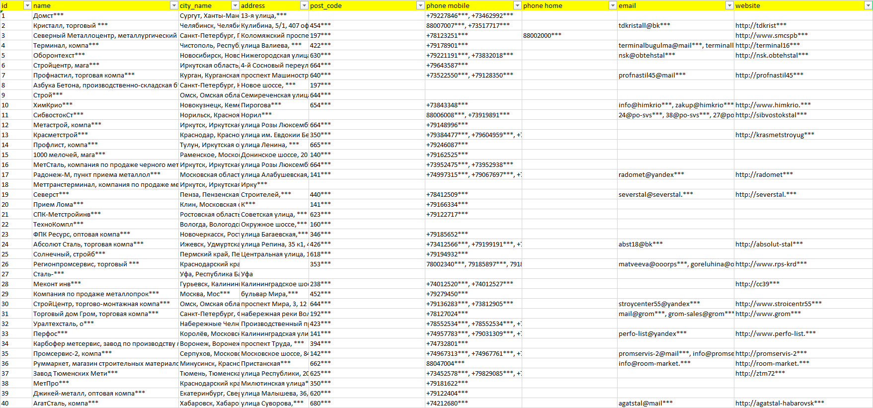 База компаний чёрный металлопрокат, вся РФ в формате Excel с эл. почтами, телефонами, сайтами, ссылками на соц сети, координатами и другой информацией. Скачайте демо версию, чтобы ознакомиться с данными.