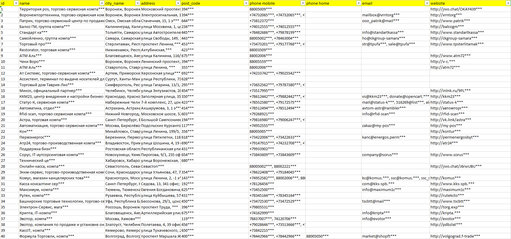 Мы автоматически собираем такие данные с различных открытых источников, обрабатываем, структурирует и упорядочиваем их, предоставляя пользователю возможность скачать результат в формате Excel. По принципу работы наш сервис аналогичен поисковым системам, таким как Google или Яндекс, но с возможностью экспорта найденной информации в удобном табличном виде.