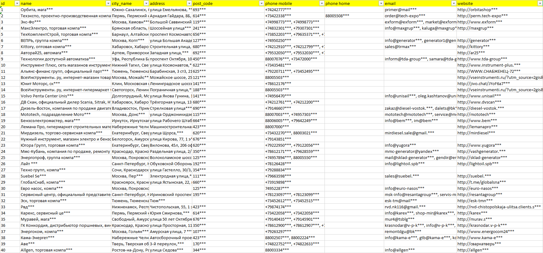 Мы автоматически собираем такие данные с различных открытых источников, обрабатываем, структурирует и упорядочиваем их, предоставляя пользователю возможность скачать результат в формате Excel. По принципу работы наш сервис аналогичен поисковым системам, таким как Google или Яндекс, но с возможностью экспорта найденной информации в удобном табличном виде.