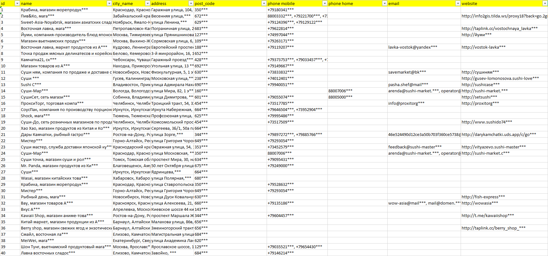 База организаций магазины ингредиентов азиатской кухни, вся Россия в формате Excel с эл. почтами, телефонами, сайтами, ссылками на соц сети, координатами и другой информацией. Скачайте демо версию, чтобы ознакомиться с данными.