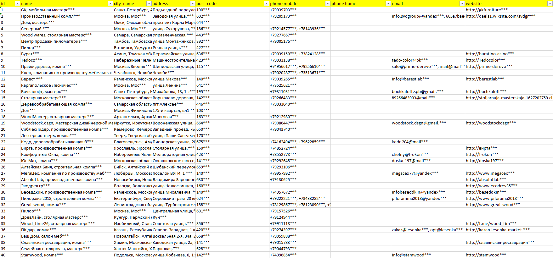 База компаний деревообработка, вся РФ в формате Excel с эл. почтами, телефонами, сайтами, ссылками на соц сети, координатами и другой информацией. Скачайте демо версию, чтобы ознакомиться с данными.