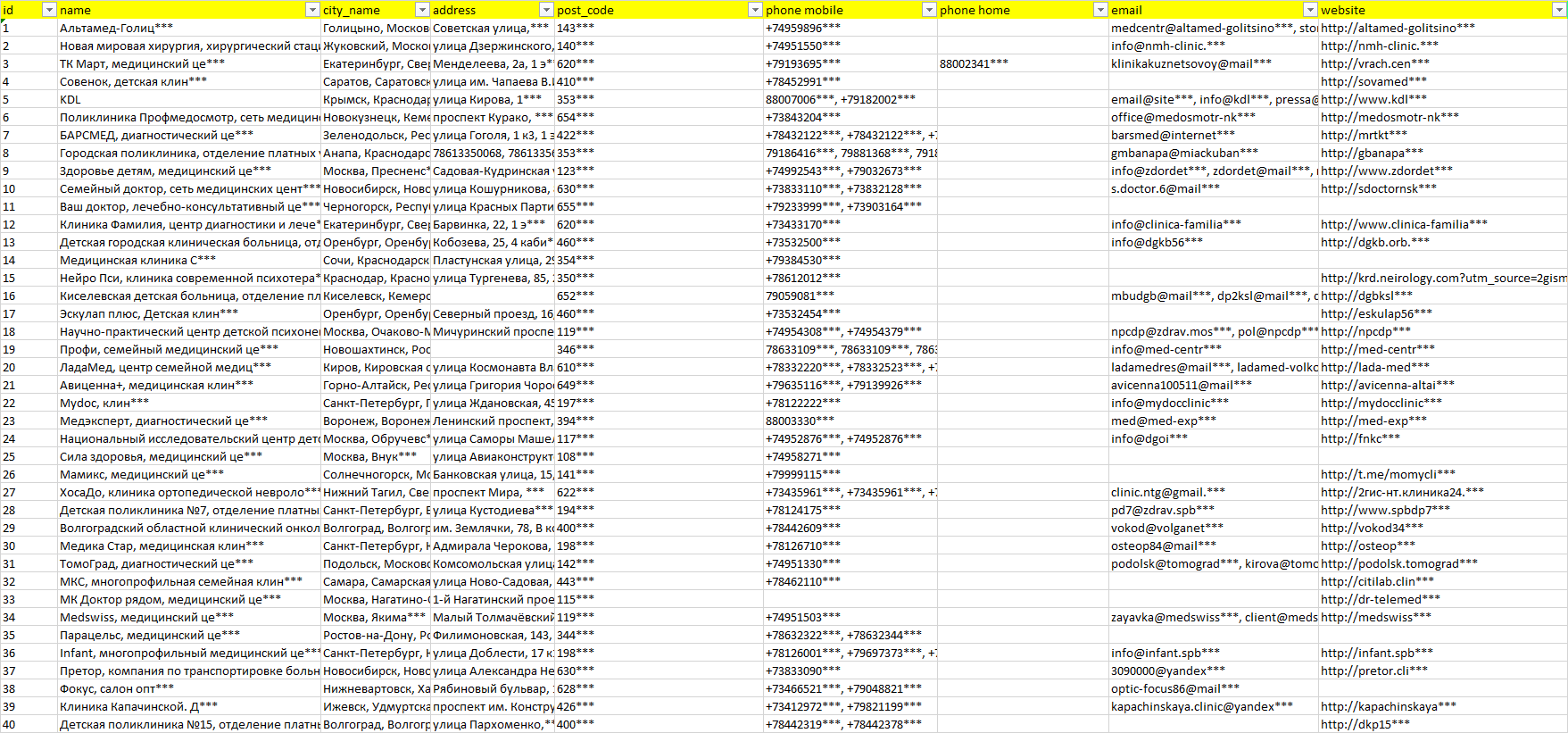 База компаний детские врачи, вся РФ в формате Excel с эл. почтами, телефонами, сайтами, ссылками на соц сети, координатами и другой информацией. Скачайте демо версию, чтобы ознакомиться с данными.