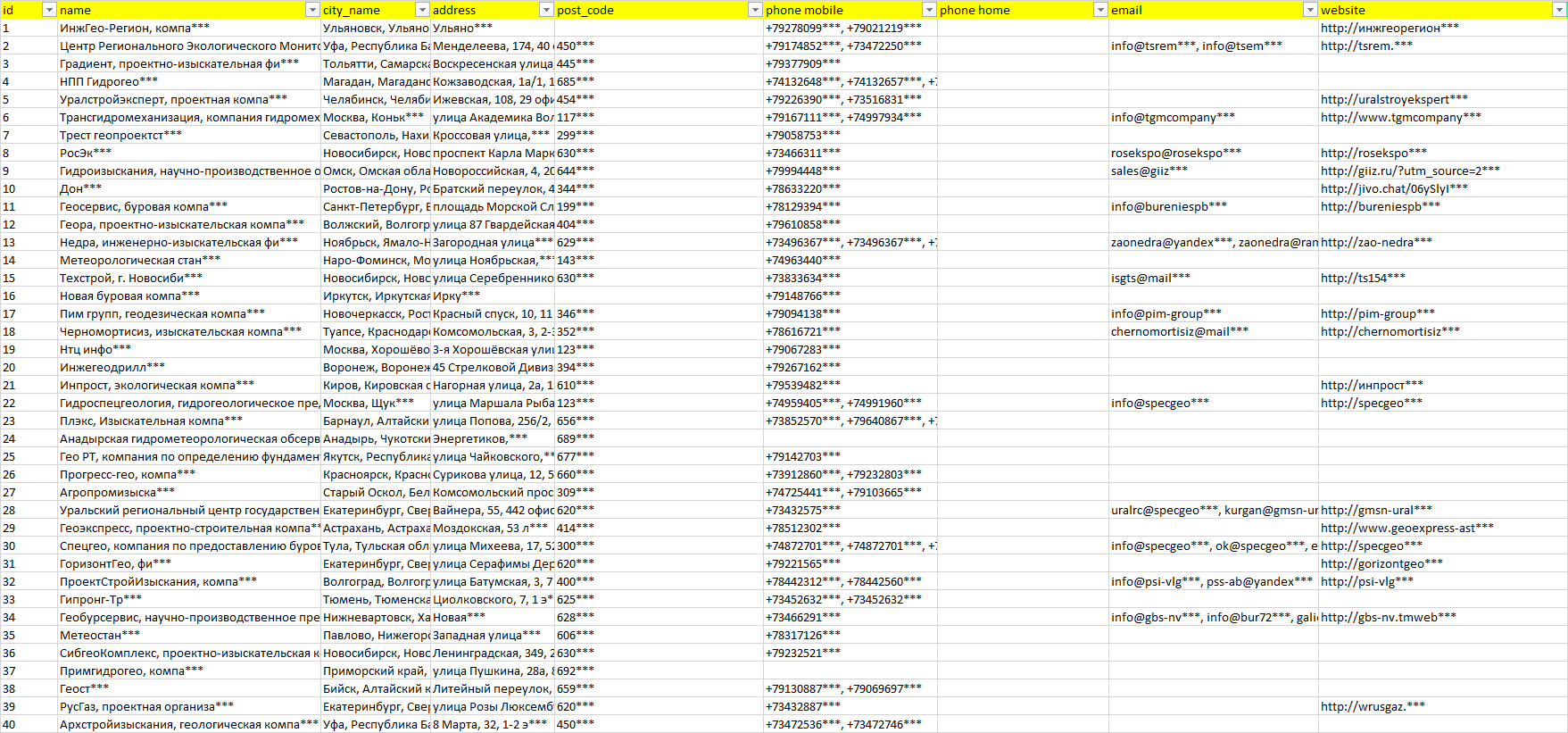 База компаний гидрогеологические работы, вся РФ в формате Excel с эл. почтами, телефонами, сайтами, ссылками на соц сети, координатами и другой информацией. Скачайте демо версию, чтобы ознакомиться с данными.