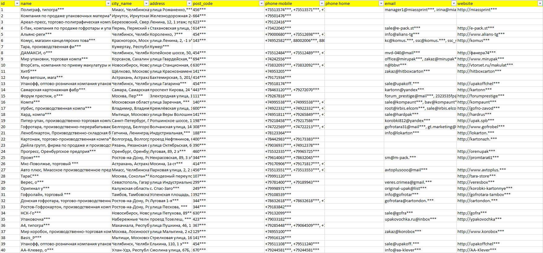 База организаций гофротара, вся Россия в формате Excel с эл. почтами, телефонами, сайтами, ссылками на соц сети, координатами и другой информацией. Скачайте демо версию, чтобы ознакомиться с данными.