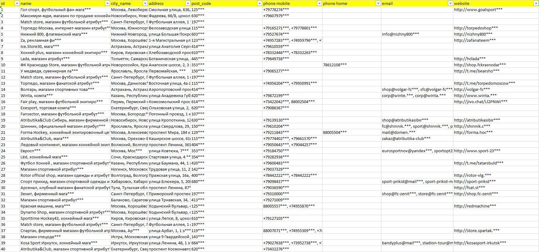 База компаний атрибутика для болельщиков, вся РФ в формате Excel с эл. почтами, телефонами, сайтами, ссылками на соц сети, координатами и другой информацией. Скачайте демо версию, чтобы ознакомиться с данными.