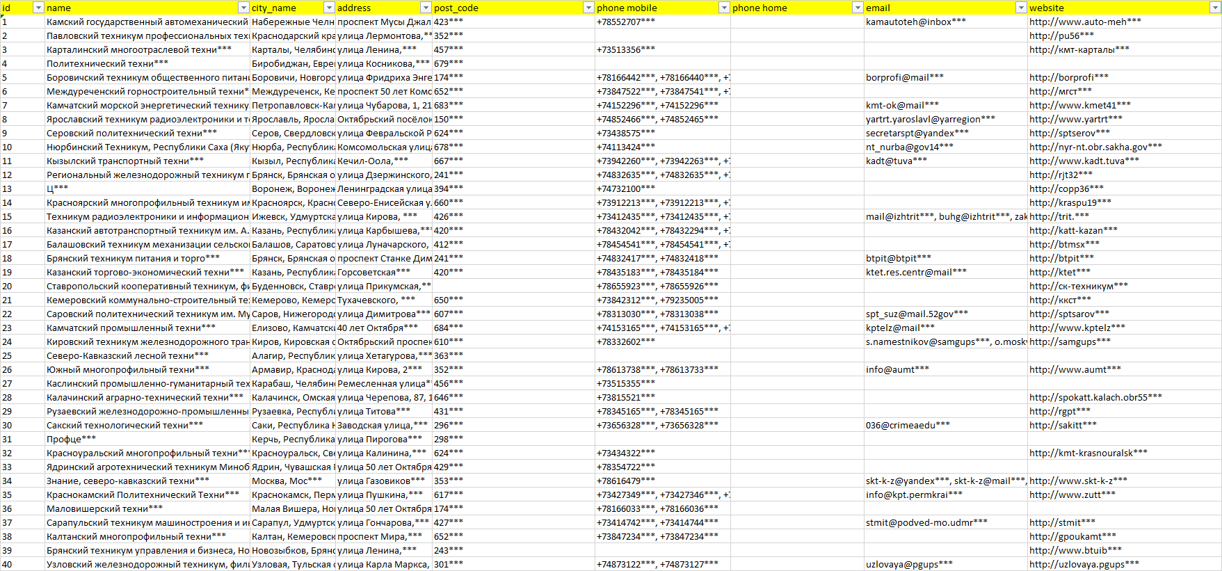 База компаний техникумы, вся РФ в формате Excel с эл. почтами, телефонами, сайтами, ссылками на соц сети, координатами и другой информацией. Скачайте демо версию, чтобы ознакомиться с данными.