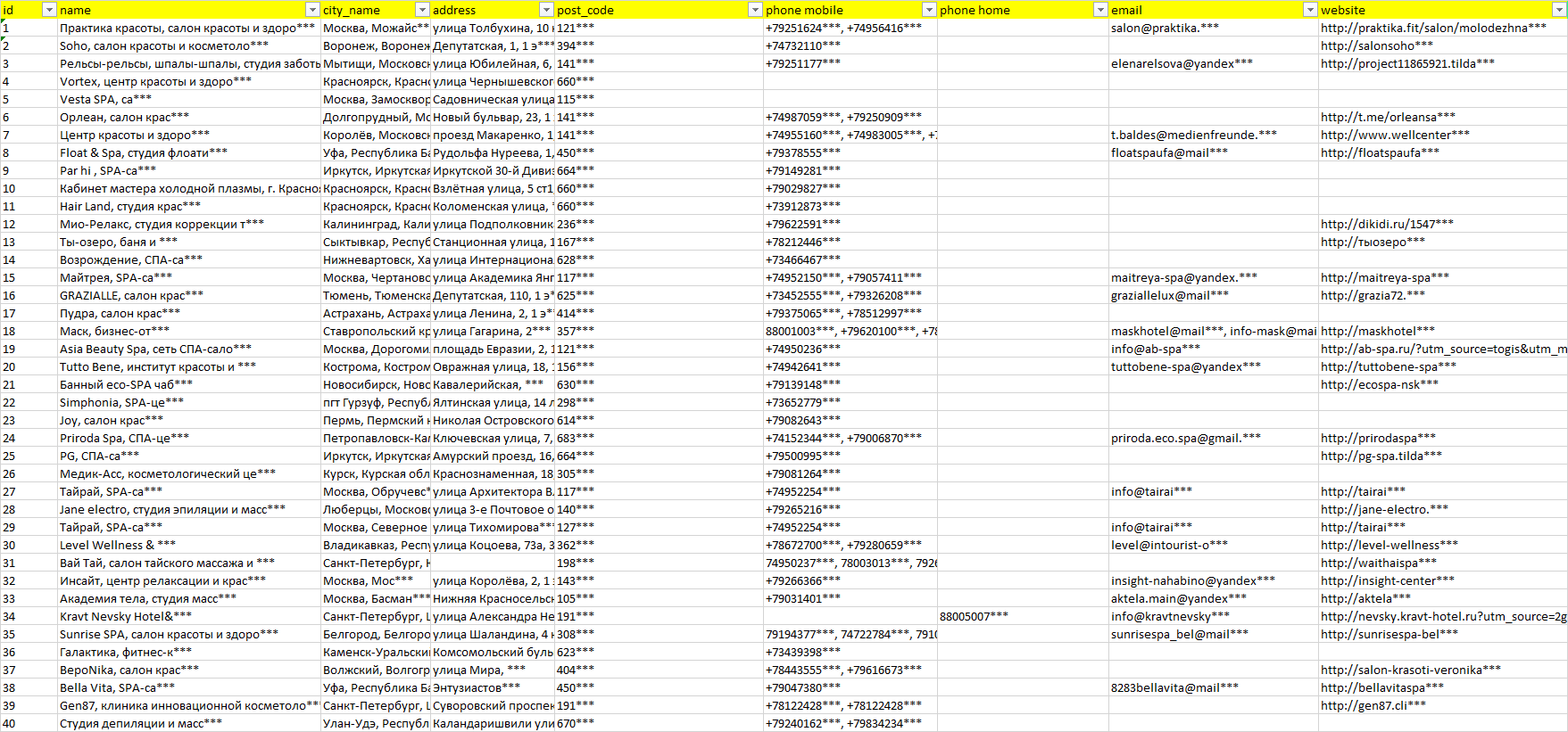 База компаний spa-процедуры, вся РФ в формате Excel с эл. почтами, телефонами, сайтами, ссылками на соц сети, координатами и другой информацией. Скачайте демо версию, чтобы ознакомиться с данными.