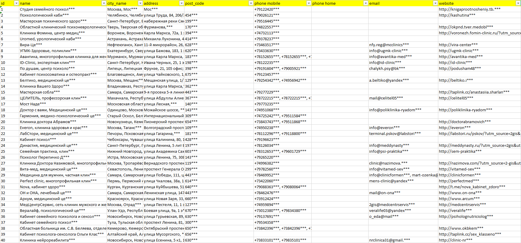 База организаций сексолог, вся Россия в формате Excel с эл. почтами, телефонами, сайтами, ссылками на соц сети, координатами и другой информацией. Скачайте демо версию, чтобы ознакомиться с данными.