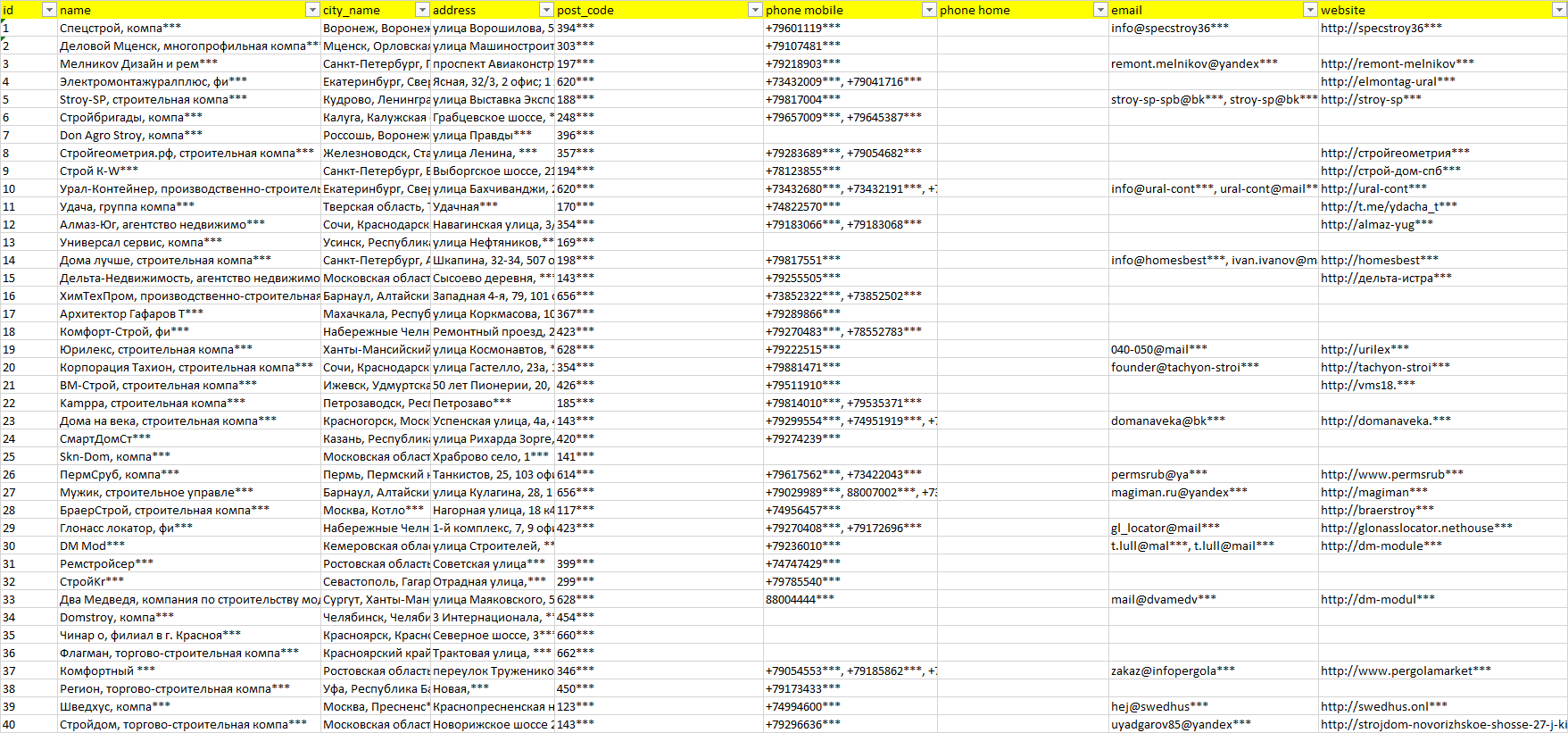 База компаний строительство дач коттеджей, вся РФ в формате Excel с эл. почтами, телефонами, сайтами, ссылками на соц сети, координатами и другой информацией. Скачайте демо версию, чтобы ознакомиться с данными.