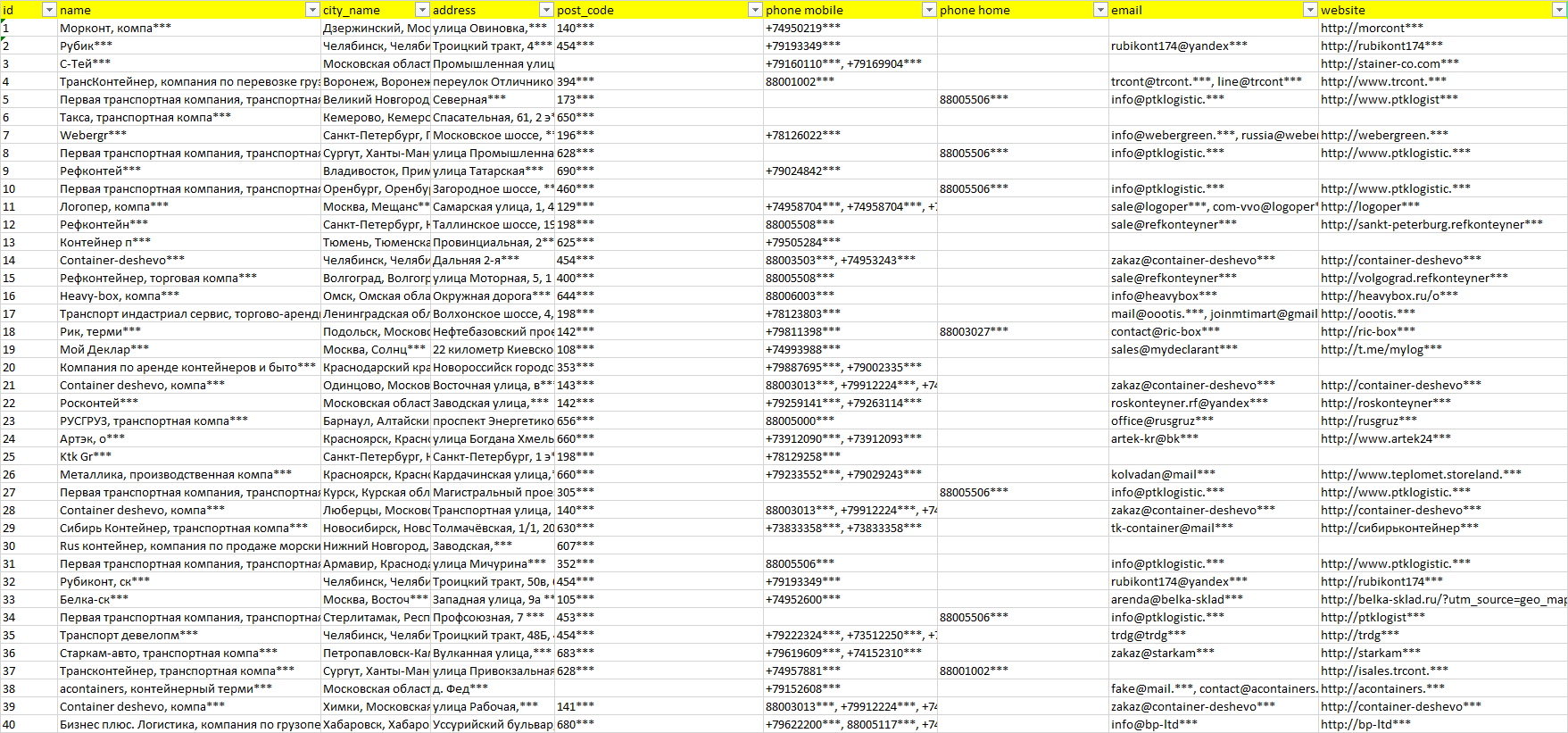 База компаний контейнеры для грузоперевозок, вся РФ в формате Excel с эл. почтами, телефонами, сайтами, ссылками на соц сети, координатами и другой информацией. Скачайте демо версию, чтобы ознакомиться с данными.