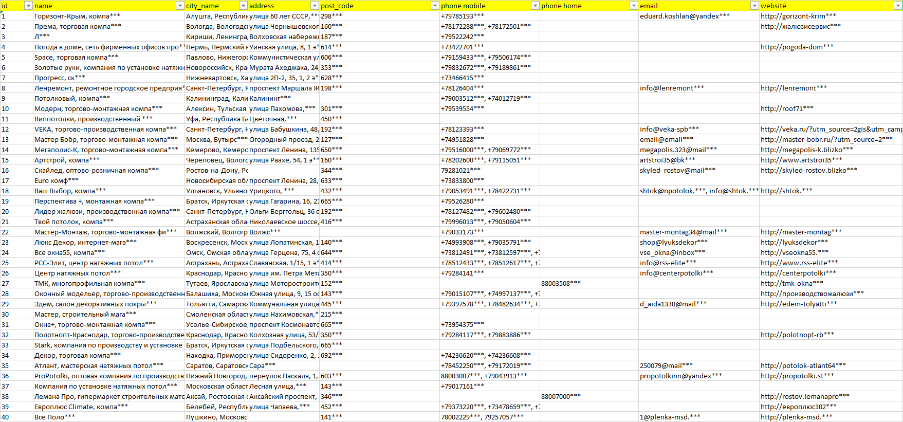 База компаний натяжные потолки, вся РФ в формате Excel с эл. почтами, телефонами, сайтами, ссылками на соц сети, координатами и другой информацией. Скачайте демо версию, чтобы ознакомиться с данными.