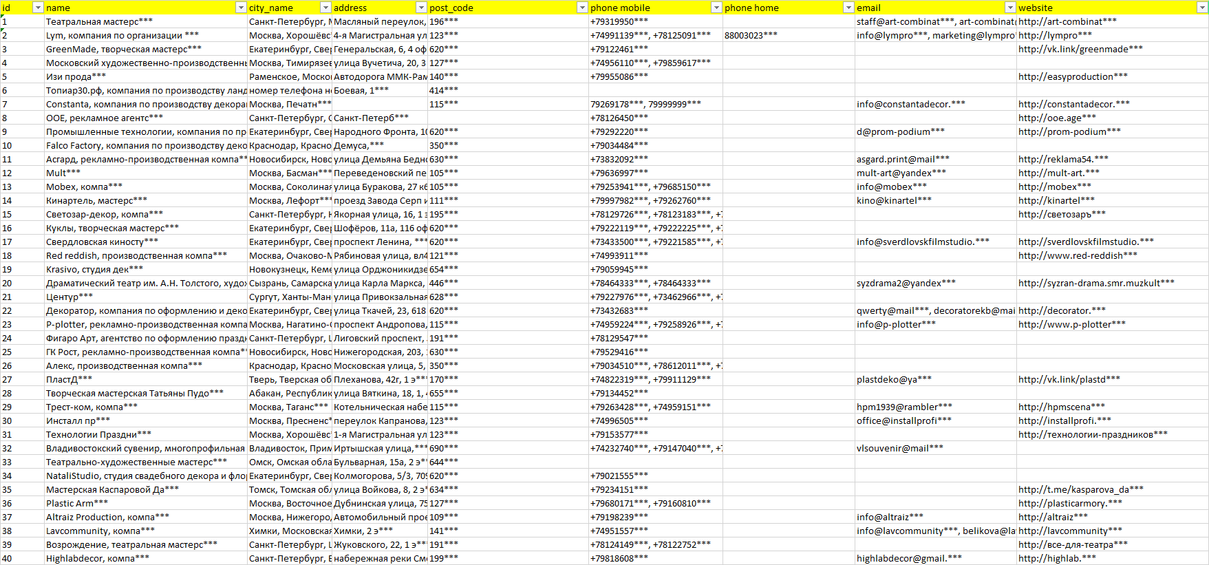 Мы автоматически собираем такие данные с различных открытых источников, обрабатываем, структурирует и упорядочиваем их, предоставляя пользователю возможность скачать результат в формате Excel. По принципу работы наш сервис аналогичен поисковым системам, таким как Google или Яндекс, но с возможностью экспорта найденной информации в удобном табличном виде.