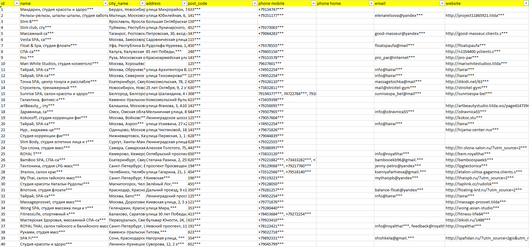 База компаний тонизирующие салоны, вся РФ в формате Excel с эл. почтами, телефонами, сайтами, ссылками на соц сети, координатами и другой информацией. Скачайте демо версию, чтобы ознакомиться с данными.