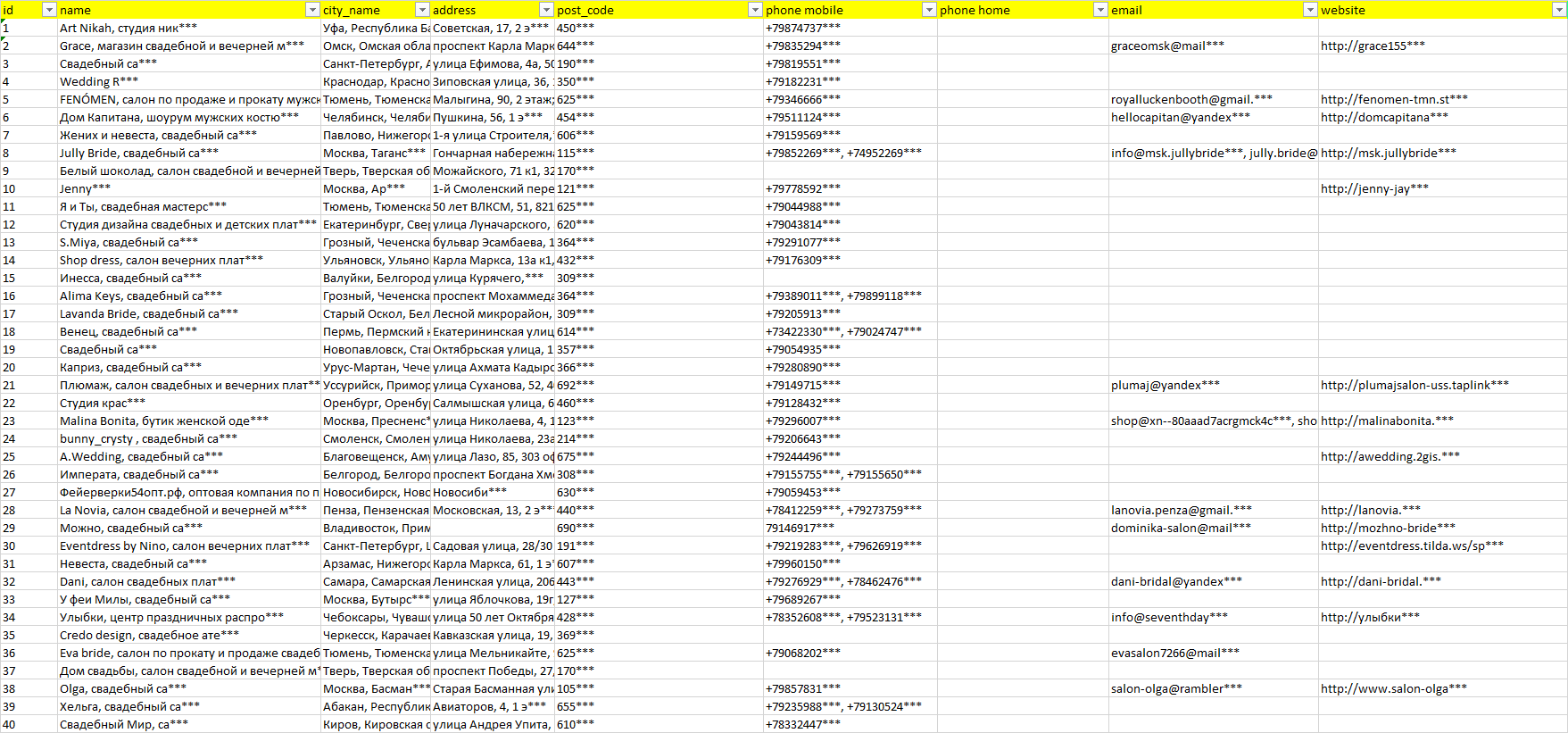 База организаций свадебные товары, вся Россия в формате Excel с эл. почтами, телефонами, сайтами, ссылками на соц сети, координатами и другой информацией. Скачайте демо версию, чтобы ознакомиться с данными.