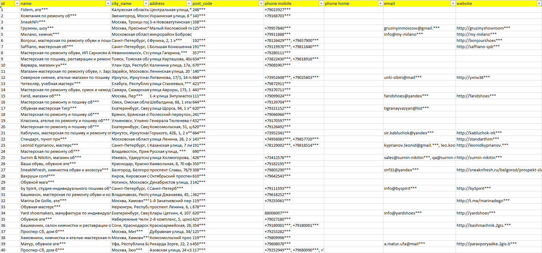 База компаний обувные ателье, вся РФ в формате Excel с эл. почтами, телефонами, сайтами, ссылками на соц сети, координатами и другой информацией. Скачайте демо версию, чтобы ознакомиться с данными.